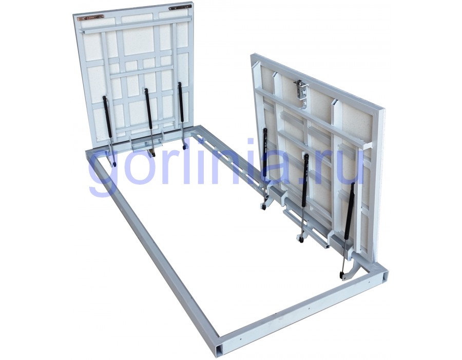Базовая модель выпускается коробке из профтрубы с листом ГВЛ на двери под скрытую установку на петлях с газовыми лифтами. Основная створка закрывается на замок, другая запирается на ригелях-шпингалетах. Открывание последовательное.