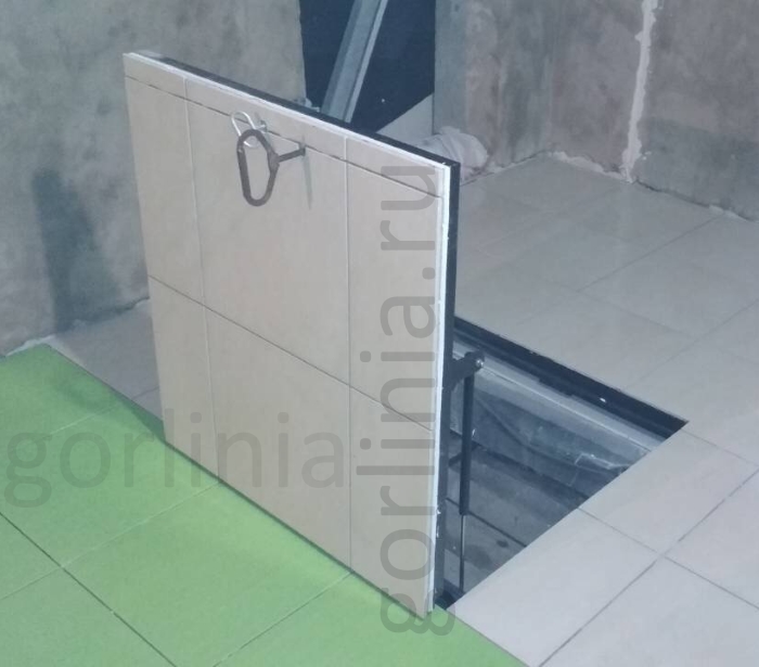 Люк выполнен в раме уголок. Установка производится методом погружения в технологический проем 60 на 120. Петли расположены по большой стороне.