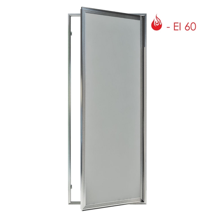 В скрытой коробке с порогом проложен огнеупорный термоактивный уплотнитель. Съемное полотно с левым или правым открыванием на себя подшивается с тыльной стороны вторым листом ГСП-DF с закладкой внутрь базальтовой плиты. Створка навешивается на скрытые осевые петли, регулируется для корректировки положения дверного шва.